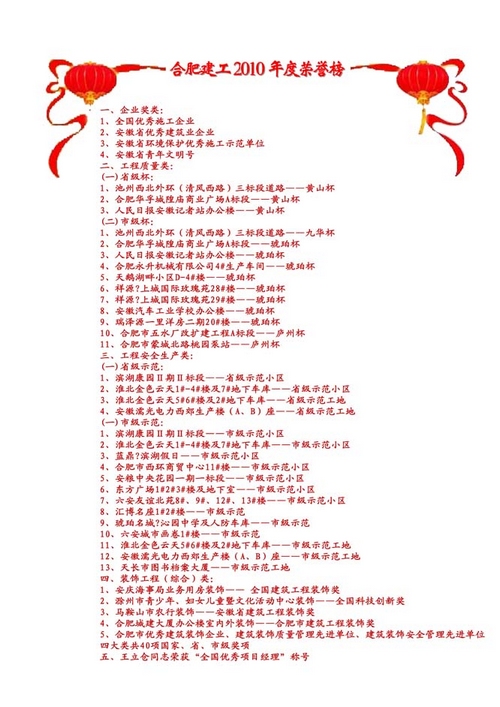 2010年度,合肥建工工程質量、安全文明生產兩大類共獲獎項31項,其中,工程質量獎項14項,工程安全生產類17項,實現合肥建工“創杯”、“創示范”的歷史新高。池州西北外環(清風西路)三標段道路、合肥華孚城隍廟商業廣場A標段及人民日報安徽記者站辦公樓等工程榮獲安徽省建設工程質量最高獎優—— “黃山杯”獎。濱湖康園Ⅱ期Ⅱ標段、淮北金色云天1#-4#樓及7#地下車庫、淮北金色云天5#6#樓及2#地下車庫,安徽濡光電力西郊生產樓(A、B)座等工程獲安徽省級示范工程稱號。